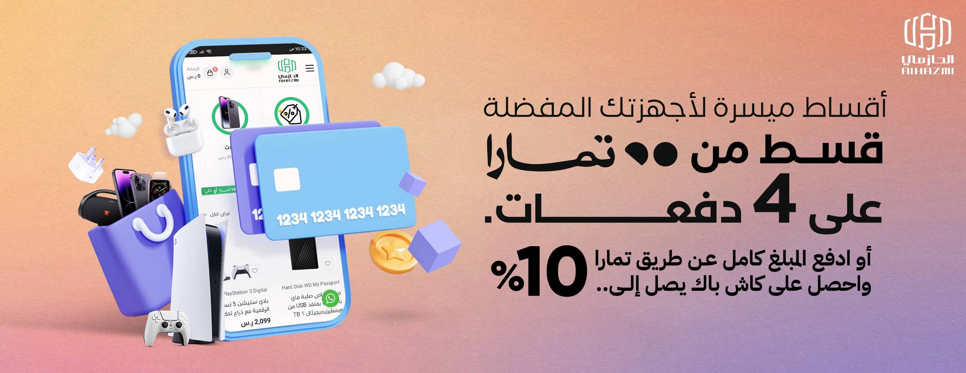 يمكنك اختيار أفضل جوالات سامسونج أو آبل أو أي جوال آخر من الحازمي للاتصالات، ثم اختيار تمارا كطريقة الدفع لتقسيم المبلغ على 4 دفعات مريحة بدون فوائد.