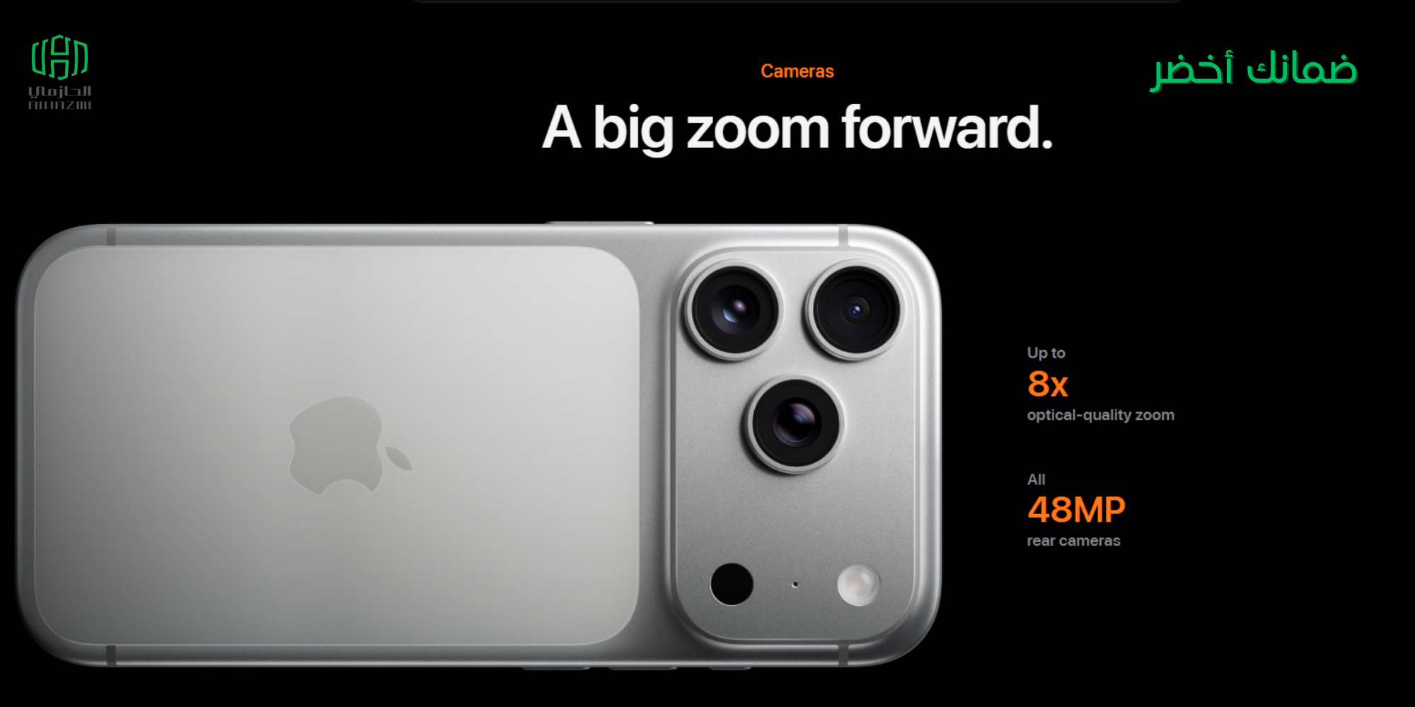 - الكاميرات:نظام تصوير Pro Fusion ثلاثي العدسات MP48 (واسعة + فائقة العرض + تيلو فوتو)، مع تحسينات مثل التثبيت البصري، قدرات تصوير عالية في الضوء المنخفض، ودقة فيديو تصل إلى K4وبدعم ProRes
