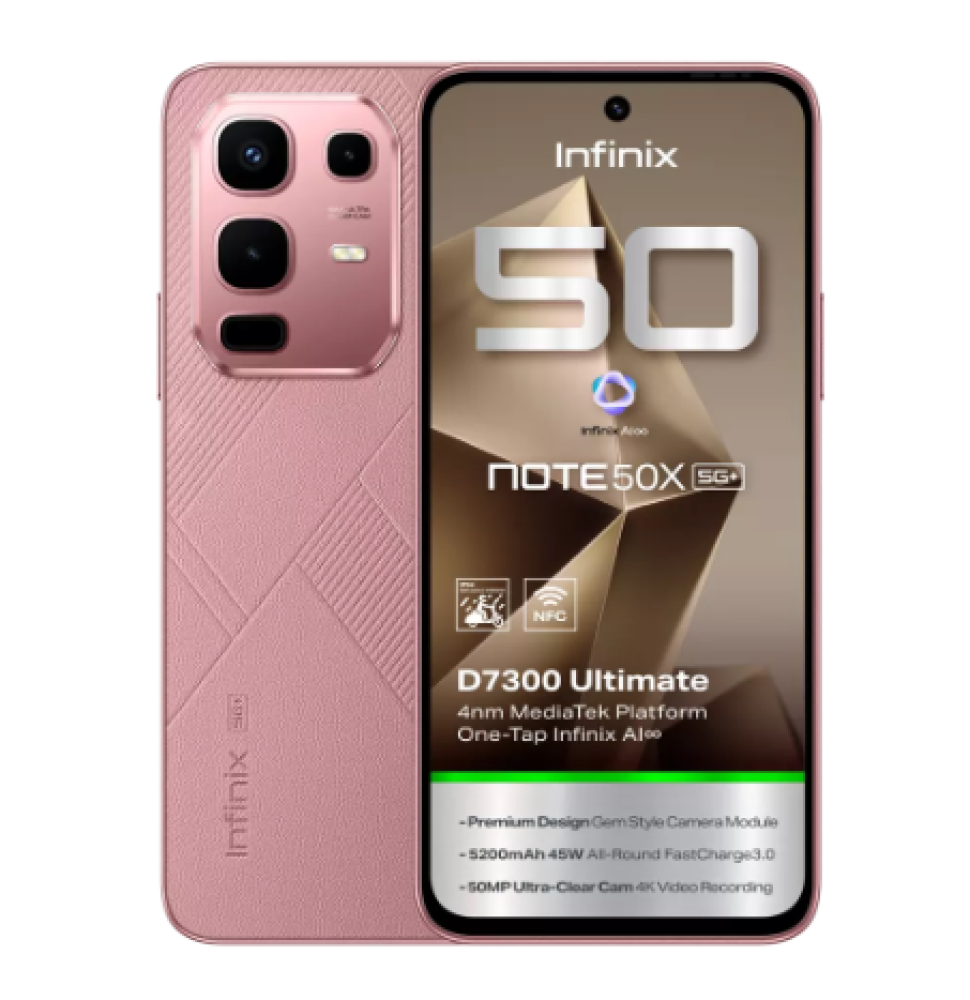 نبذة سريعة عن إنفينيكس نوت 50X 5Gهاتف ذكي يجمع بين القوة والأناقة بسعر اقتصادي مذهل! يأتي باللون الوردي الجذاب (Sunset Spice Pink)، مع شاشة IPS LCD مقاس 6.67 بوصة بدقة HD+ ومعدل تحديث 120 هرتز لسلاسة فائقة في التصفح والألعاب. يعمل بمعالج MediaTek Dimensity 7300 Ultimate (بتقنية 4 نانومتر)، مع ذاكرة 8 جيجابايت رام فعلية + 8 جيجابايت رام افتراضية (بتقنية Memory Fusion)، وتخزين 256 جيجابايت قابل للتوسعة. يدعم شبكات 5G، ويضم بطارية 5500 مللي أمبير مع شحن سريع 45 واط (الشاحن مُدرج في العلبة!).